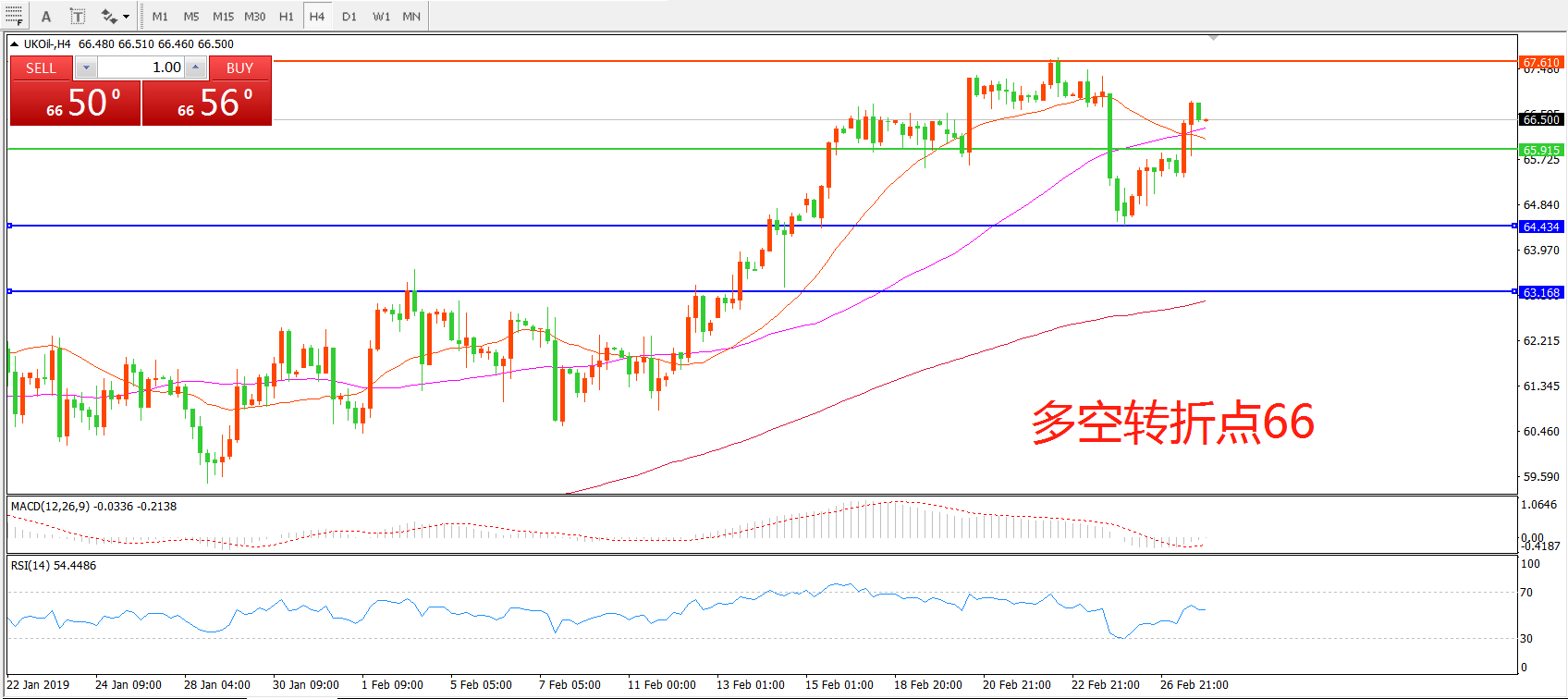 4小时图看,油价回踩55均线后企稳上行,21均线逐渐下穿,形成死叉,MACD绿柱减少,红柱增加,日内预计以66-67.5之间震荡为主。