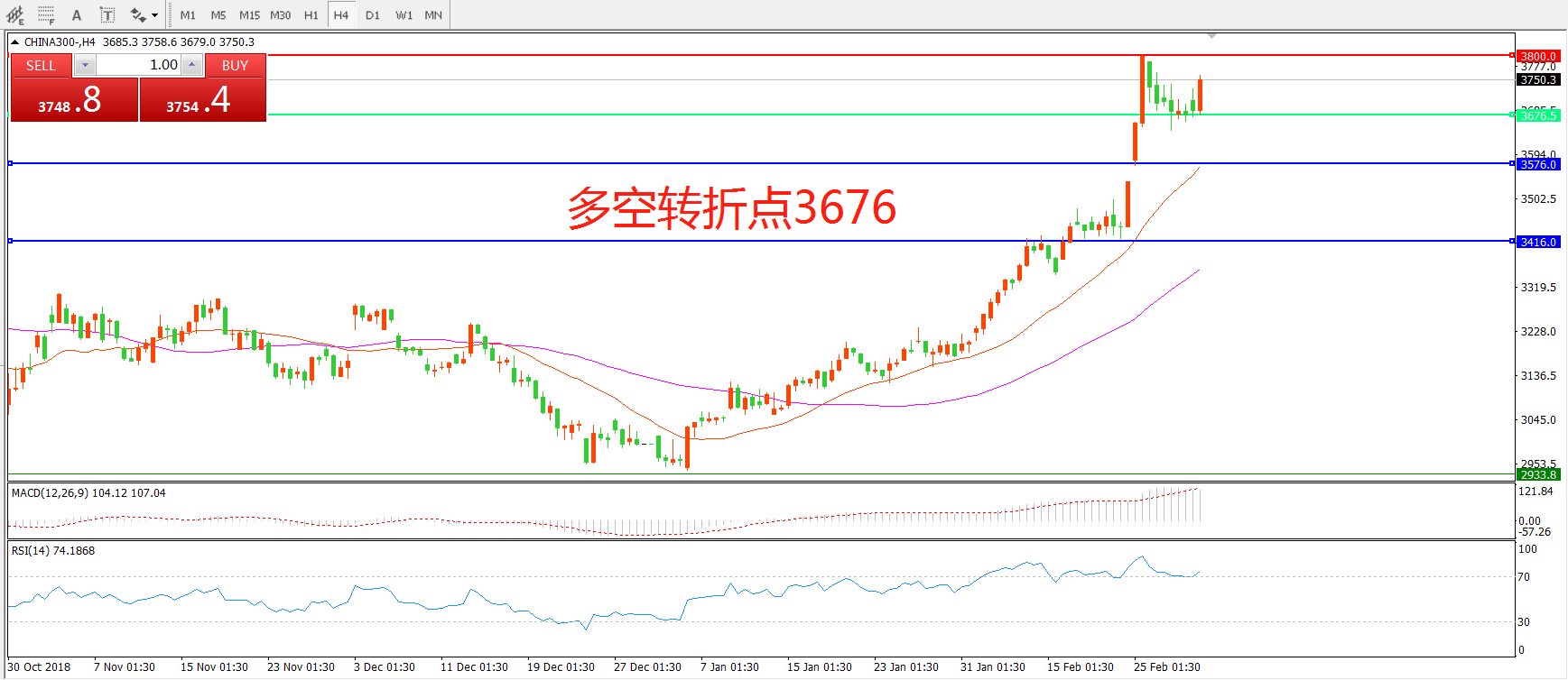 4小时图看,CHINA300中华指数触及上方3800一线出现回落,短期依然处于调整期,但均线系统呈多头排列, MACD红柱增加,整体思路逢低做多。