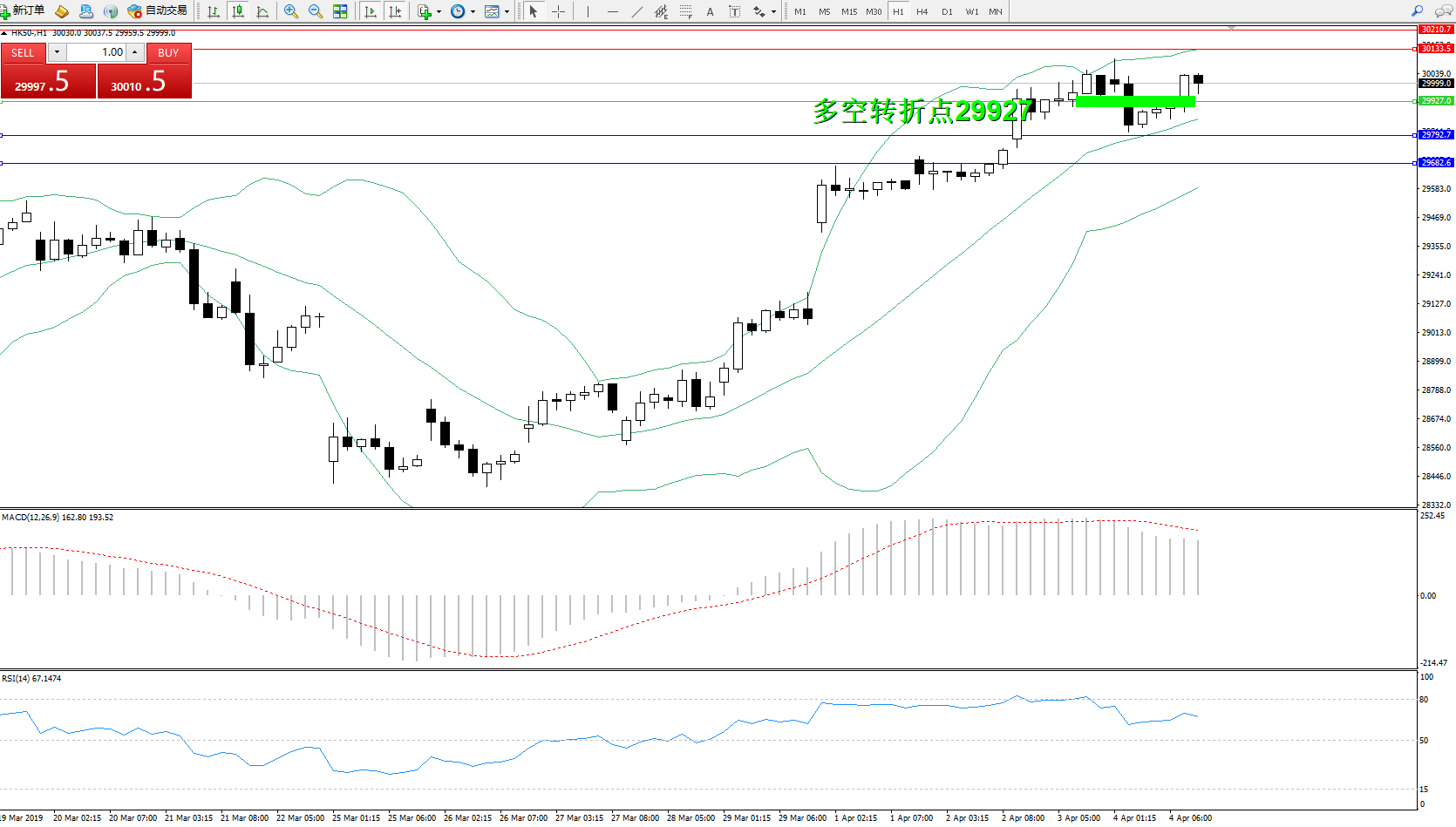 恒指HK50 ——1小时K线图显示: