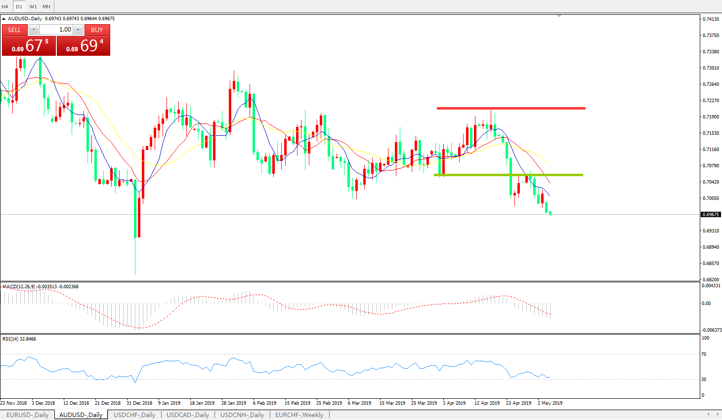 技术面简析:日图均线有序空头排列看跌汇价多空转折区域下方反弹无力继续下行MACD下穿0轴且动能柱0轴下方放量,RSI逐步走弱预计汇价反弹整理后将进一步下行