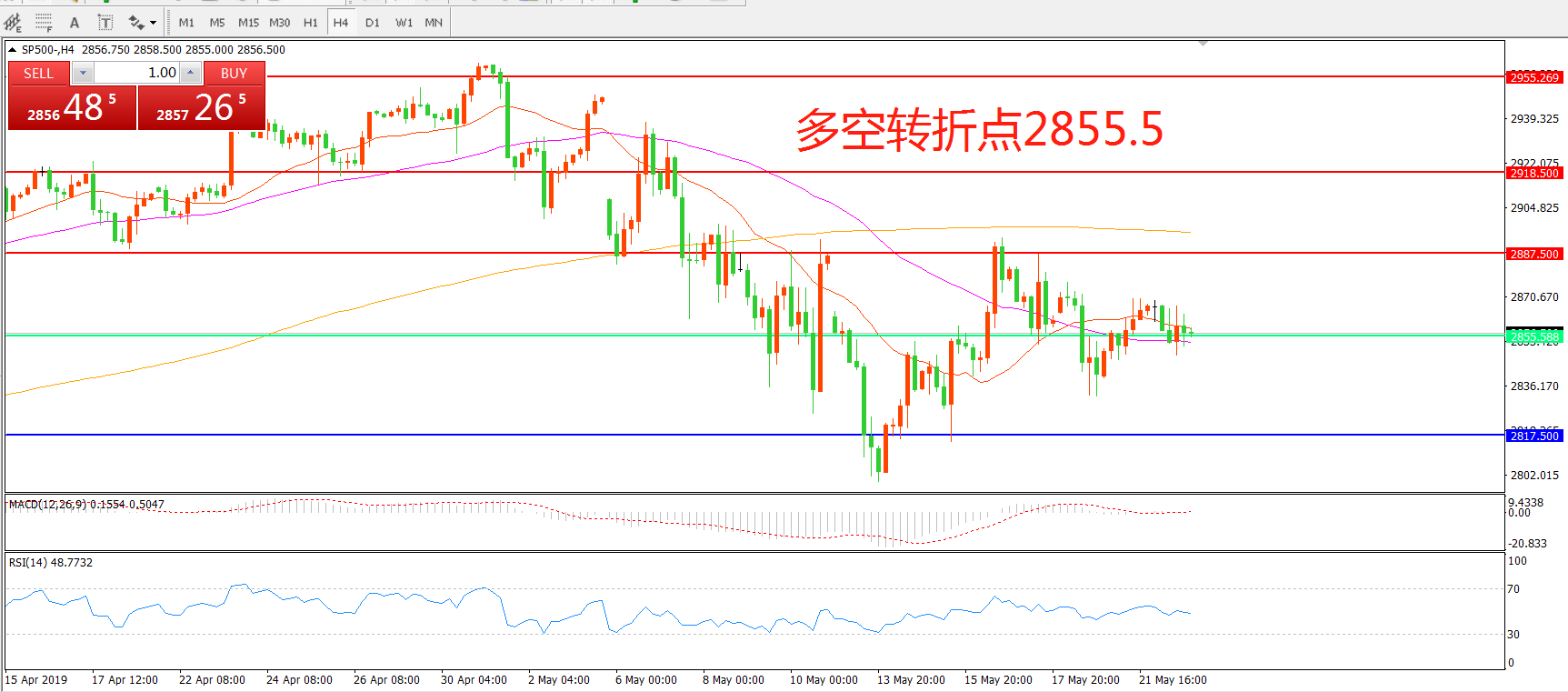 4小时图看,标普500阳整体呈现三角形整理形态,价格围绕2855.5一线进行争夺,短期均线逐渐走平, MACD红柱增加,日内预计以震荡形态为主。