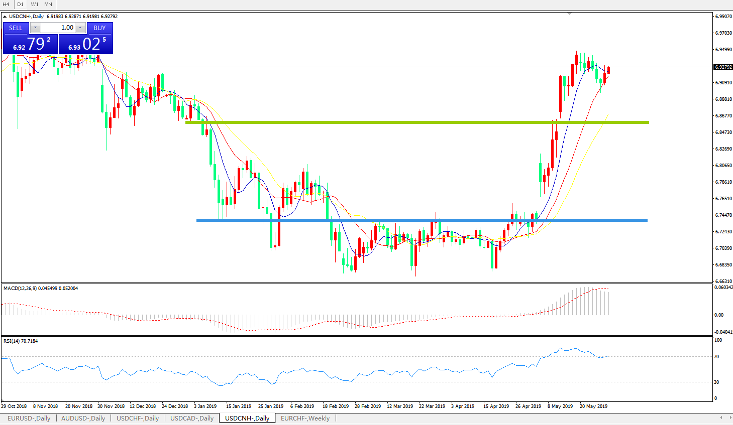 技术面简析:日线图均线整体维持攻势,MACD在0轴上方运行但动能柱有缩量迹象,RSI超买区域运行,汇价强力上攻后宽幅整理,预计短期汇价下行回踩需求,中期重点关注中美贸易争端后续进展。