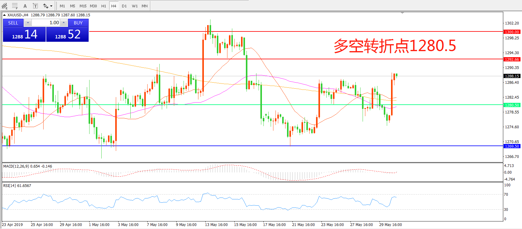 北京时间周四(5月30日),除中美貿易緊張局勢依然嚴峻之外,意大利局勢也相當動蕩,有消息稱,意大利副總理薩爾維尼準備解散意大利政府,這令市場避险情绪升温,现货黄金一度涨近10美元,刷新5月16日以来新高,最终收报1288.20美元/盎司。除此之外金价还收到各国央行持续购买的支撑撑,包括俄罗斯,哈萨克斯坦和中国在4月份继续购买黄金。