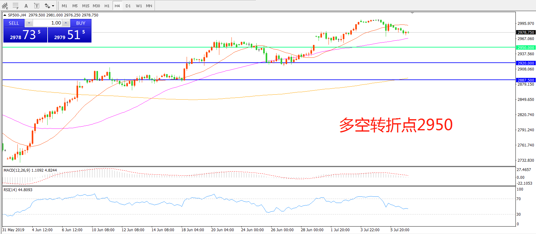 4小时图看,标普站稳2950后震荡上行,反弹动能较强,55周期均线形成为下方支撑,MACD红柱缩短,RSI指标拐头向下,日内延续震荡概率较大。