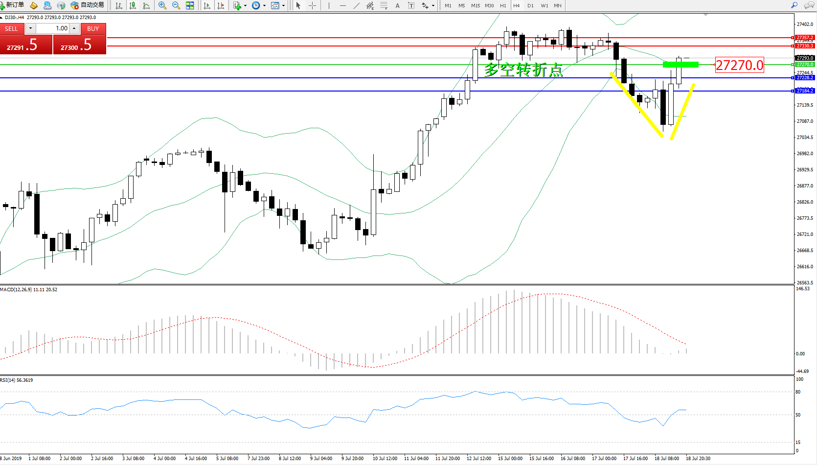 技术点评:高位弱势震荡后快速下挫V型反转上行,突破布林带指标中轨压制,多头动力强势,MACD指标处于0轴上方窄幅整理,RSI指标突破50均衡线进入多头区域后持续徘徊;