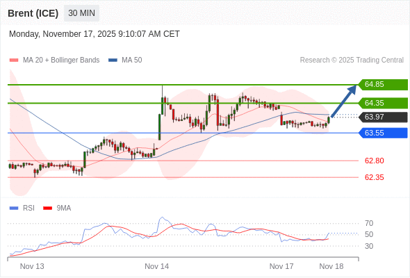 在 63.55 之上,看涨,目标价位为 64.35 ,然后为 64.85 。
