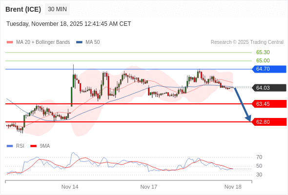 在 64.70 之下,看跌,目标价位为 63.45 ,然后为 62.80 。