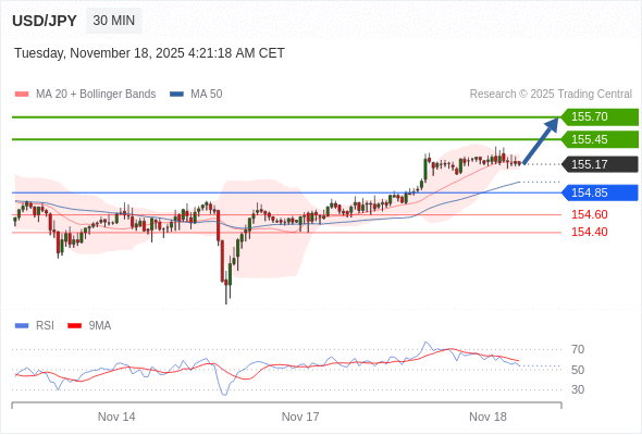 在 154.85 之上,看涨,目标价位为 155.45 ,然后为 155.70 。
