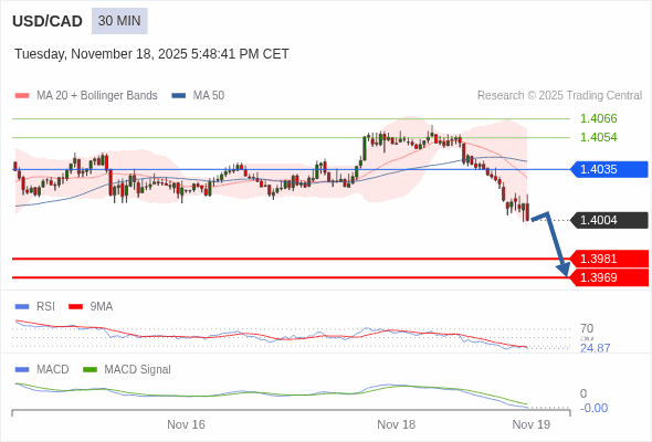 技术点评: RSI技术指标小于30。在这种情况下,说明有很强的下跌趋势,或者意味着处在超卖的状态下,可能会有向上的反弹。我们将观察RSI技术指标是否出现背离现象。 MACD技术指标处在其信号线之下看空。 配置为负。 此外,价位低于其20天及50天移动平均线 ( 分别位于1.4030 和1.4040 )。