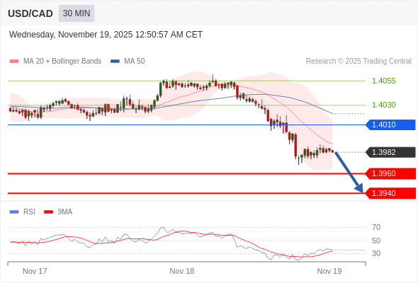 在 1.4010 之下,看跌,目标价位为 1.3960 ,然后为 1.3940 。