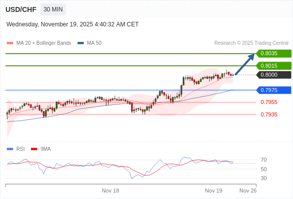 在 0.7975 之上,看涨,目标价位为 0.8015 ,然后为 0.8035 。