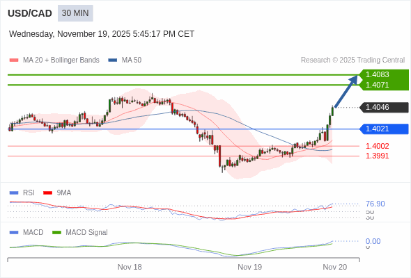 技术点评: RSI技术指标大于70。在这种情况下,说明有很强的上升趋势,或者意味着处在超买的状态下,可能会有向下的调整。我们将观察RSI技术指标是否出现背离现象。 MACD技术指标处在其信号线之上看多。 配置为正。 此外,价位高于其20天及50天移动平均线 ( 分别位于1.4009 和1.3998 )。 最后,价位突破其布林线通道上轨 (位于1.4036。