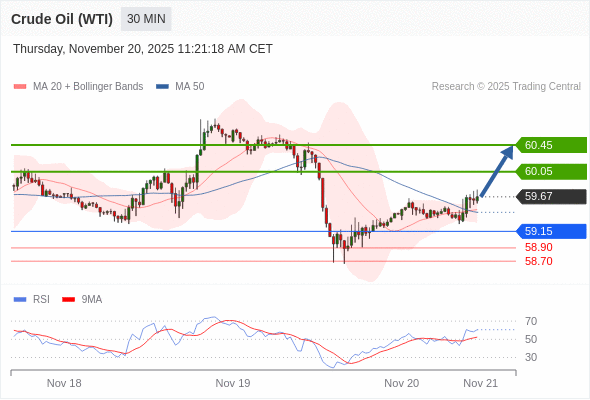 在 59.15 之上,看涨,目标价位为 60.05 ,然后为 60.45 。