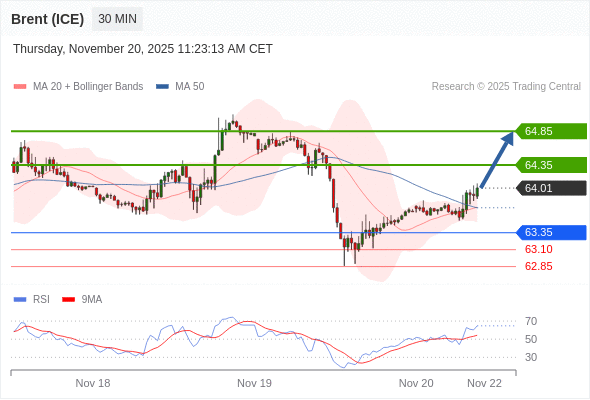 在 63.35 之上,看涨,目标价位为 64.35 ,然后为 64.85 。