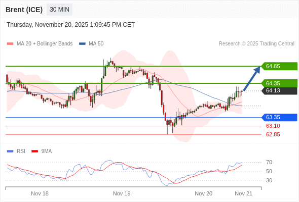 在 63.35 之上,看涨,目标价位为 64.35 ,然后为 64.85 。
