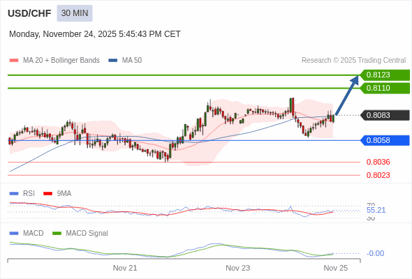 美元/瑞郎 当日内 : 看涨,当 0.8058 未被跌破。