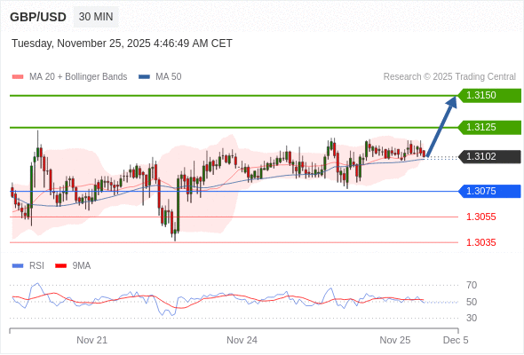 在 1.3075 之上,看涨,目标价位为 1.3125 ,然后为 1.3150 。