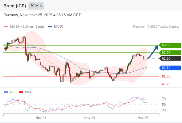 在 62.10 之上,看涨,目标价位为 62.90 ,然后为 63.30 。