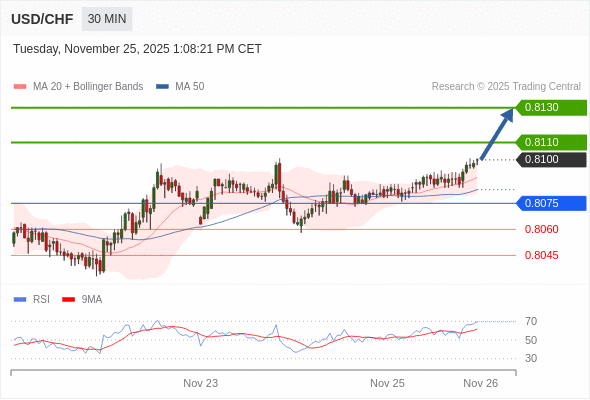 在 0.8075 之上,看涨,目标价位为 0.8110 ,然后为 0.8130 。