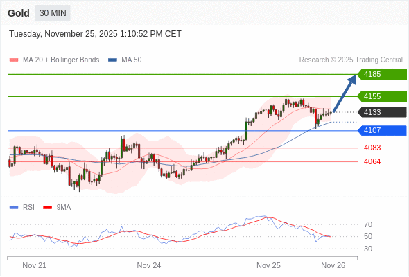 在 4107 之上,看涨,目标价位为 4155 ,然后为 4185 。