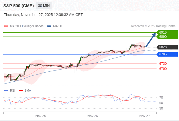 在 6785 之上,看涨,目标价位为 6890 ,然后为 6915 。