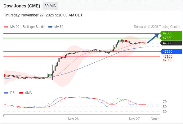 在 47250 之上,看涨,目标价位为 47660 ,然后为 47800 。