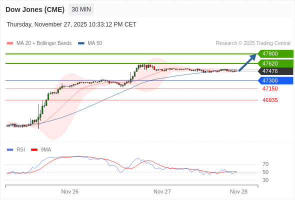 在 47300 之上,看涨,目标价位为 47620 ,然后为 47800 。