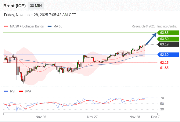 在 62.60 之上,看涨,目标价位为 63.50 ,然后为 63.85 。