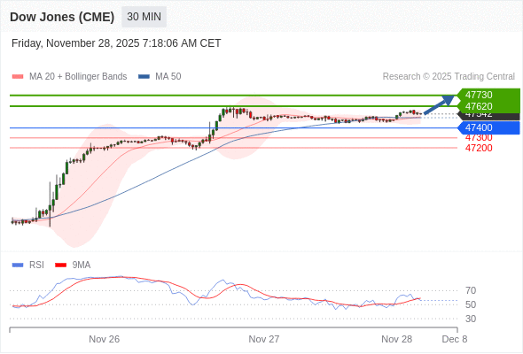 在 47400 之上,看涨,目标价位为 47620 ,然后为 47730 。