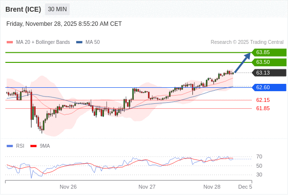 在 62.60 之上,看涨,目标价位为 63.50 ,然后为 63.85 。