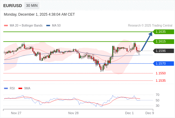 在 1.1570 之上,看涨,目标价位为 1.1615 ,然后为 1.1635 。