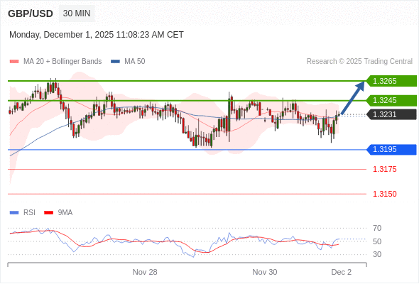 在 1.3195 之上,看涨,目标价位为 1.3245 ,然后为 1.3265 。