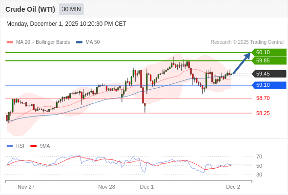 在 59.10 之上,看涨,目标价位为 59.85 ,然后为 60.10 。