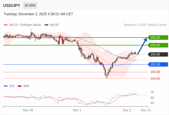 在 155.20 之上,看涨,目标价位为 155.95 ,然后为 156.25 。