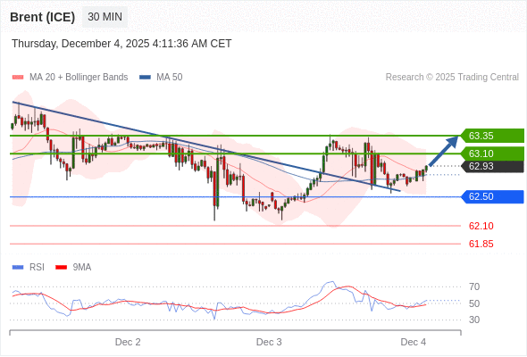 在 62.50 之上,看涨,目标价位为 63.10 ,然后为 63.35 。