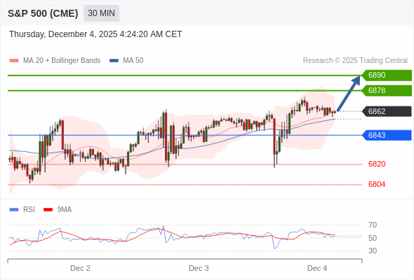 在 6843 之上,看涨,目标价位为 6878 ,然后为 6890 。