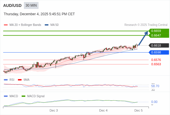 澳元/美元 当日内 : 看涨,当 0.6598 为支撑位。