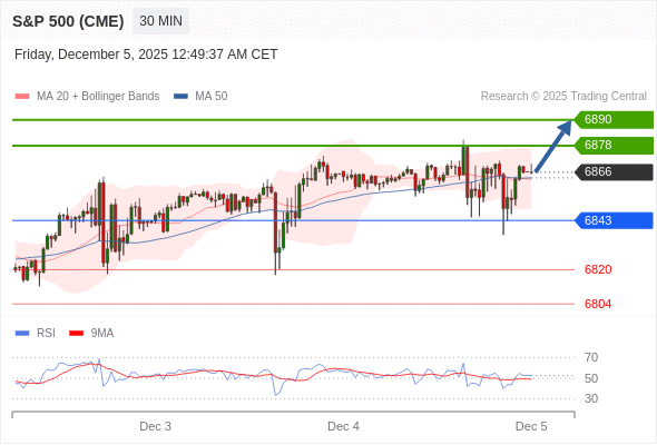 在 6843 之上,看涨,目标价位为 6878 ,然后为 6890 。