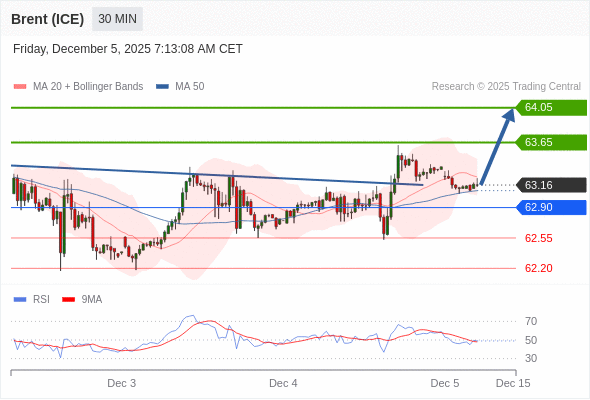 在 62.90 之上,看涨,目标价位为 63.65 ,然后为 64.05 。
