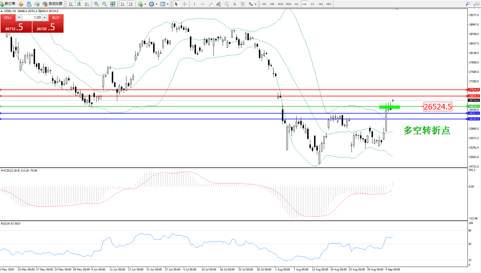 香港恒生指数9月5日(周四)收盘下跌7.70点,跌幅0.03%,报26515.53点;市场气氛好转,港股今早低开后再转升,升幅之后不断扩大,曾见26697点,涨174点。信诚联席董事表示,由于A股急升带动港股走高,而且近来多间大型公司作回购动作,令市埸认为股市已大致见低,投资者信心亦开始渐增。他又指,上日港股升逾千点后,今早未见回落,可见后市有力企稳二万六关,若央行进一步降准,港股更有望突破五十天线(约27200点)。