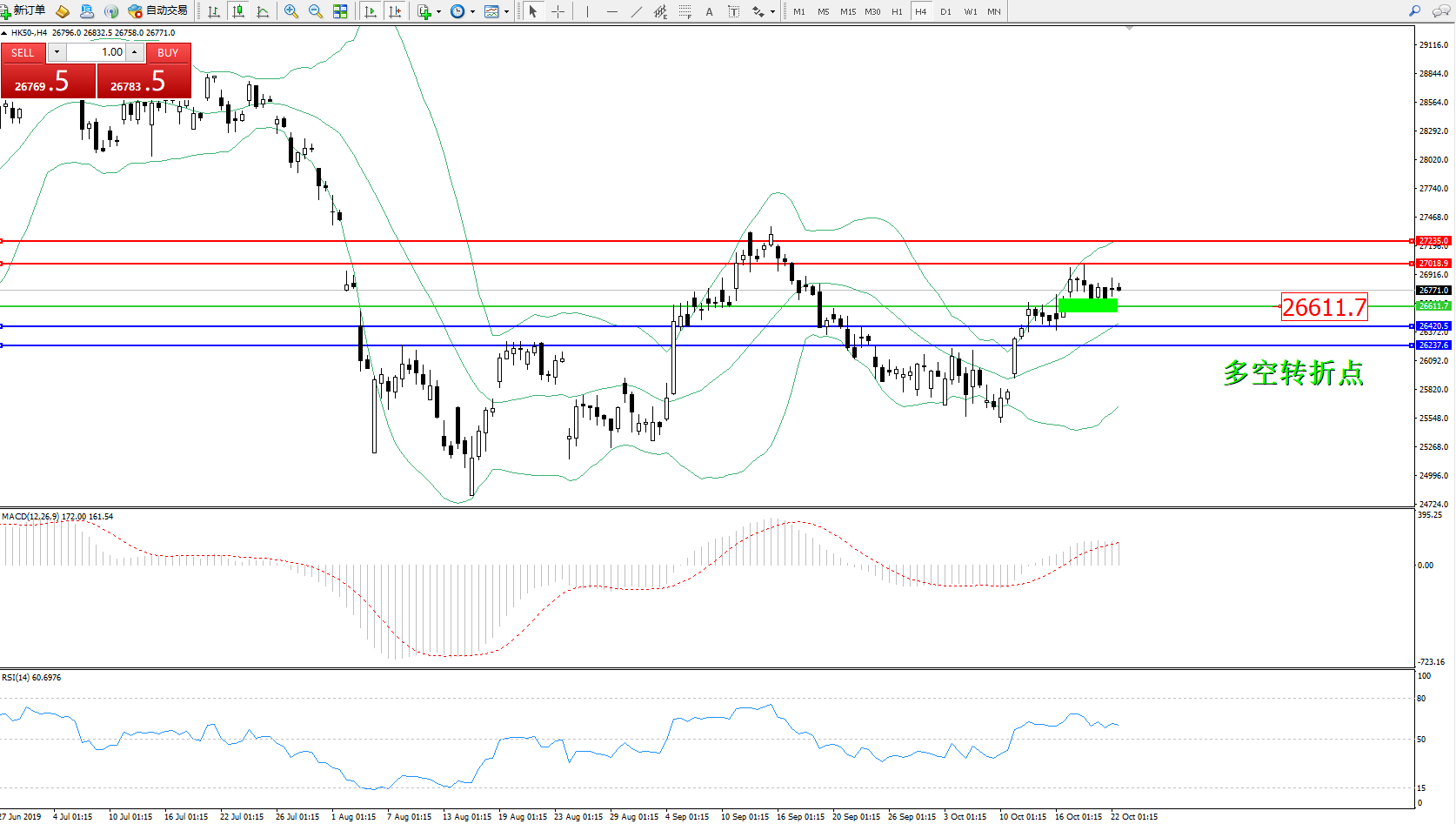 香港恒生指数10月22日(周二)收盘上涨60.52点,涨幅0.23%,报26786.20点;港股早上小幅高开后再小量向上,恒指最多升118点,高见26844。高位见沽压回落,曾倒跌27点,续在升跌附近横行。缩量上涨对恒指而言并非坏事,主要表明市场仍处于观望状态,但入市的意愿较为强烈。投资者观望外围局势的变化,及静待联储局月底减息。市场观望的气氛较为浓厚,预计恒指会继续出现窄幅震荡格局。