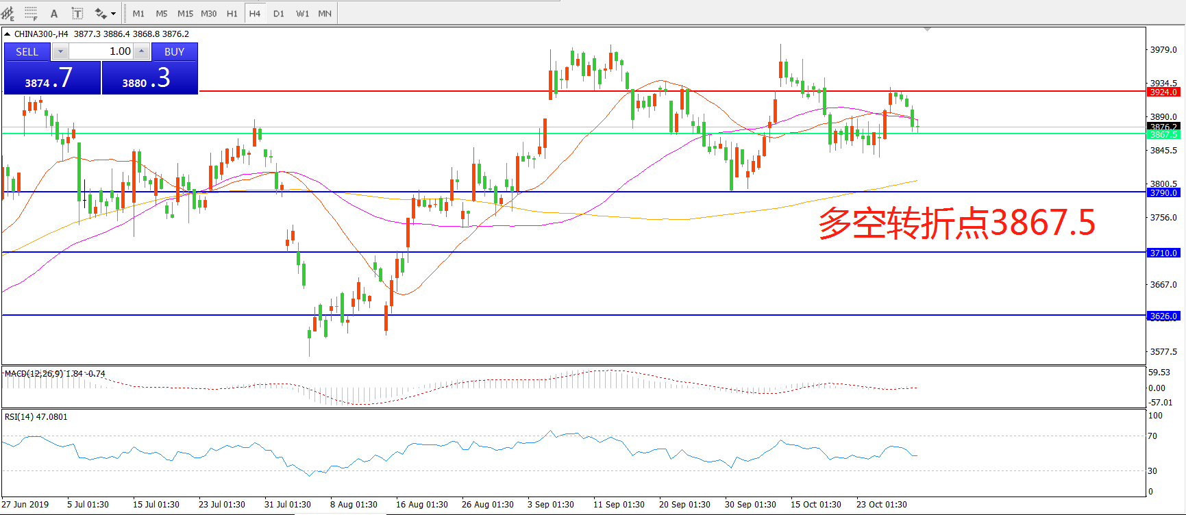 4小时图看,沪深300触碰3924阻力后震荡回落,3867.5成为短期多空分水岭,均线系统走平,MACD红柱缩短,RSI指标向平,日内延续震荡较大。
