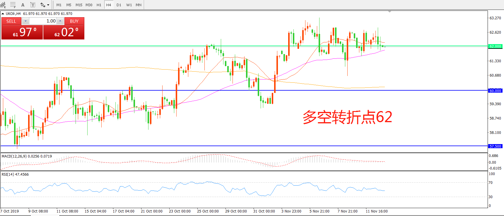 周二(11月12日),特朗普在纽约经济俱乐部就贸易政策与贸易谈判发表了讲话,他在讲话中突出了目前全球贸易局势的积极进展,但在中美贸易关系方面并没有透露实质性的信息,这令未来不确定性依然存在。风险情绪波澜不惊令油价窄幅波动, 布伦特原油周二收报62.06美元/桶。
