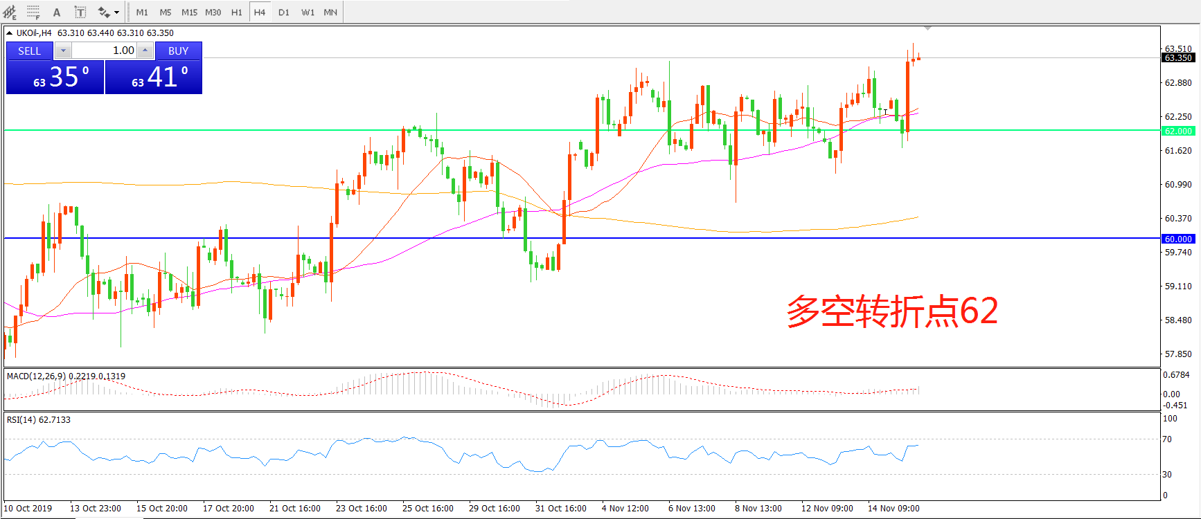 4小时图看,油价呈现震荡上行,短期走势偏强,62美金成为明显支撑,均线系统走平,MACD红柱增加,RSI指标走平,日内延续上行概率较大。