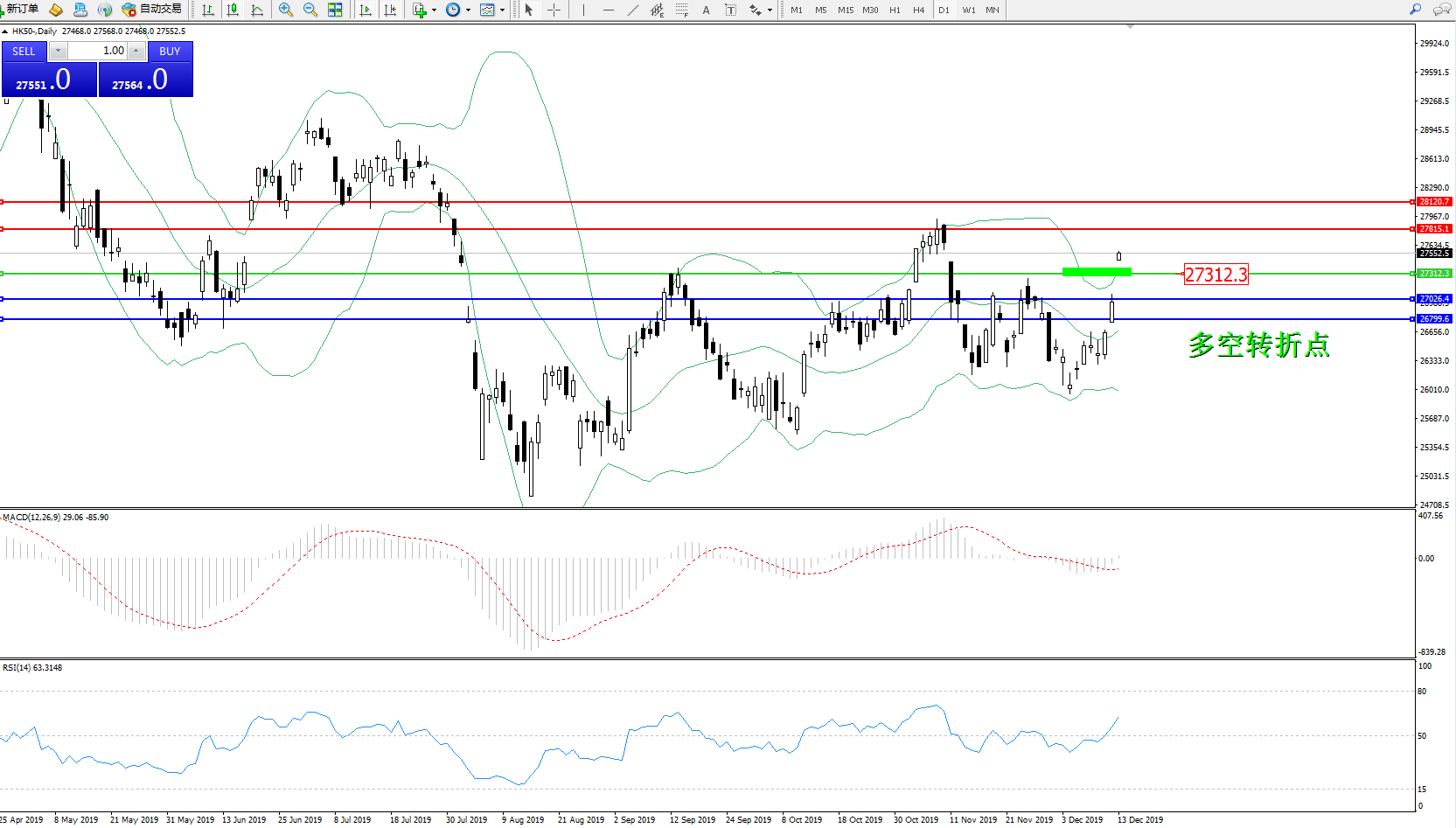 香港恒生指数12月12日(周四)收盘上涨348.71点,涨幅1.31%,报26994.14点;港股恒生指数高开高走,逼近27000点。对港股战略看多,或迎缩小版“戴维斯双击”;行业配置关键词为“价值回归、成长分化”,建议布局低估值、“抗通胀”、“软服务”三条主线。美国总统特朗普发表的关税方面言论,提振了市场乐观情绪,资金流入股市。引爆了市场上的风险情绪,恒指跳空高开。
