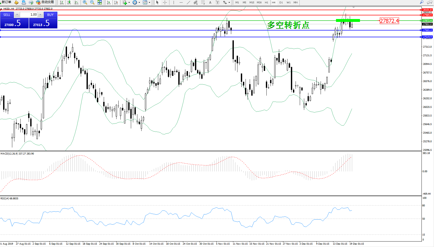 香港恒生指数12月19日(周四)收盘下跌83.72点,跌幅0.30%,报27800.49点;港股小幅高开后触及27908,沽盘涌现,股市回落再倒跌,并扩大跌幅至最多跌208点,低见27675。港股目前进入闷局,本周恒指可能会下试回调至27500点水平位置。当前多空力量相当,预计恒指近日或将迎来震荡整固走势。市场观望美国总统特朗普弹劾进展,隔晚美股表现反复,港股连升两日后,恒指出现回吐。