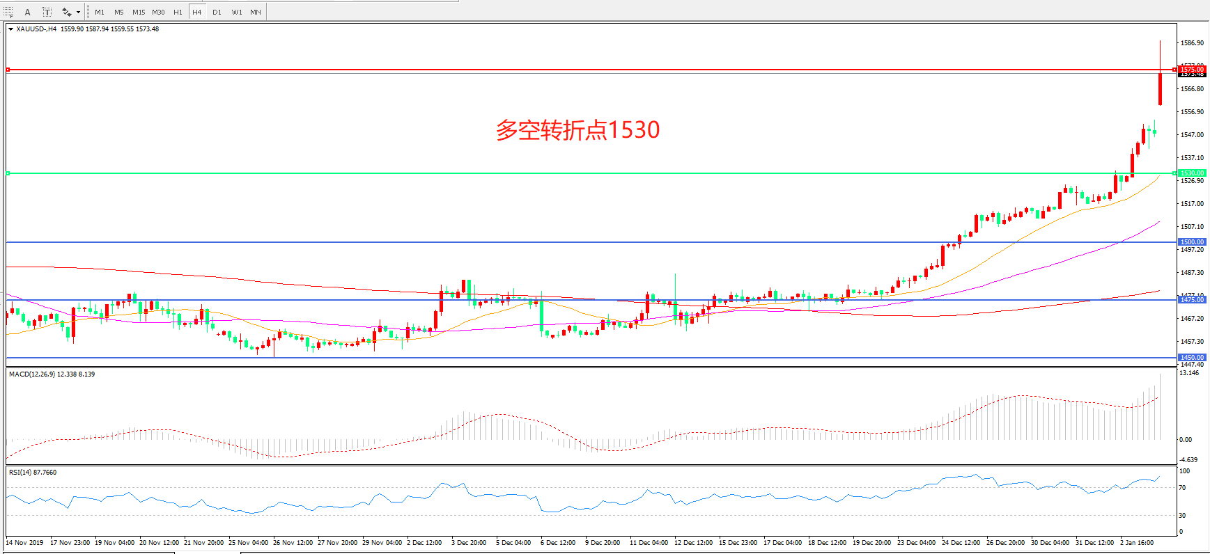 据中新网援引路透社报道,当地时间3日凌晨,伊拉克首都巴格达国际机场附近发生突发事件,有什叶派领导人以及伊朗伊斯兰革命卫队官员死亡。路透社指出,美国官员证实,疑与伊朗有关的巴格达机场遇袭系美国所为,中东局势的再度升级推升黄金跳空高开,现货黄金开盘走高逾10美元,一度涨破1580美元,预计后市仍以上行为主。