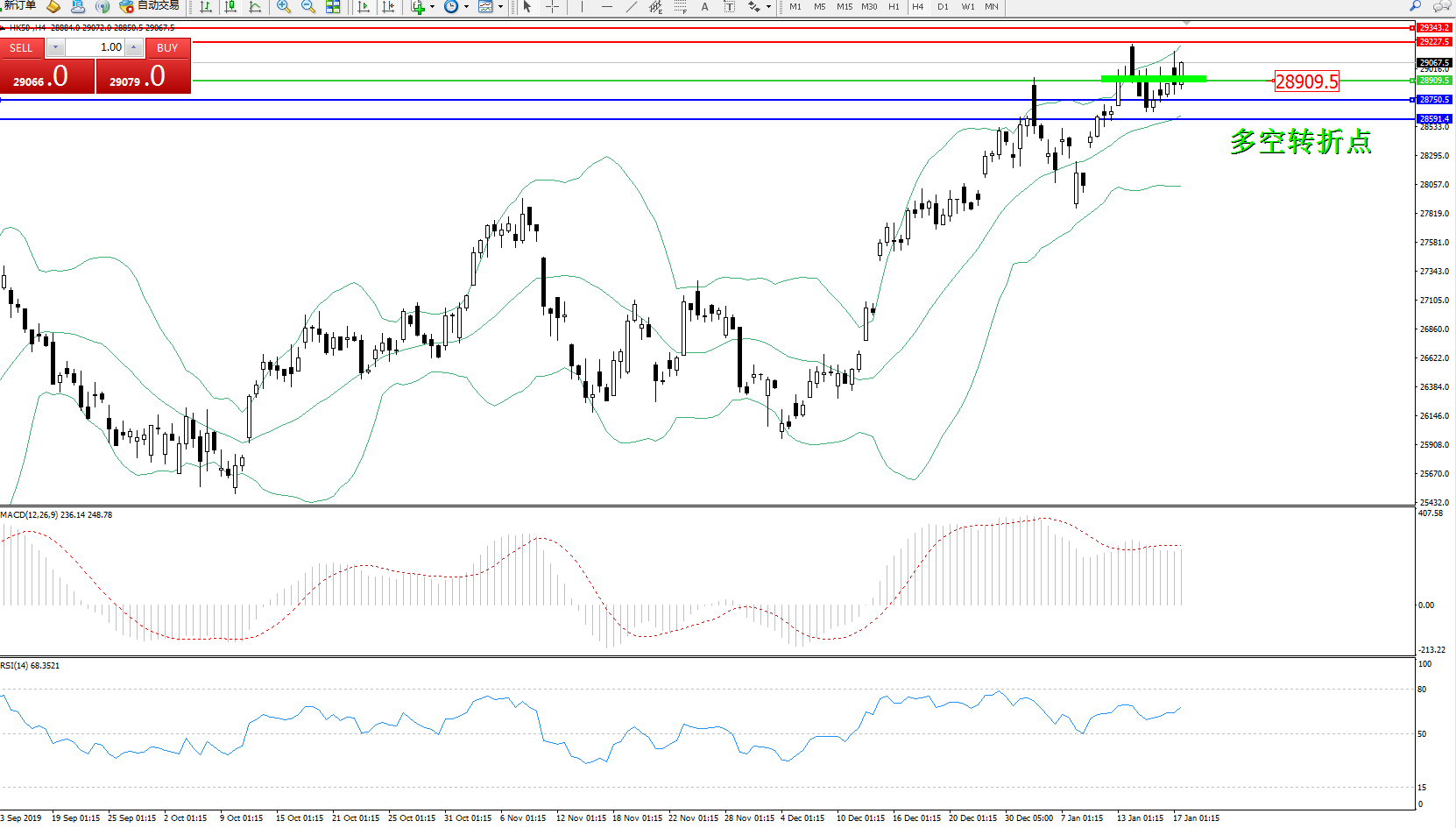 香港恒生指数117日(周五)收盘上涨173.38点,涨幅0.60%,报29056.42点;港股早上跟随美股创历史新高收市而高开,但仅升过百点。高位见沽盘即回落倒跌,恒指最低见28813。内地公布数据理想,大市低位企稳后再反弹造好,高见29101,重上29000关口,上周首次申请失业救济人数意外减少,同时201912月零售销售月率为0.3%,符合市场预期。港股目前处于相对高位,在无利好消息的继续刺激下,预计恒指走势依然会偏向稳健。注意到恒指尾盘有小幅拉升的动作,可以说目前市场投资氛围依然积极活跃,长期来看,港股还具备良好的上升势头。
