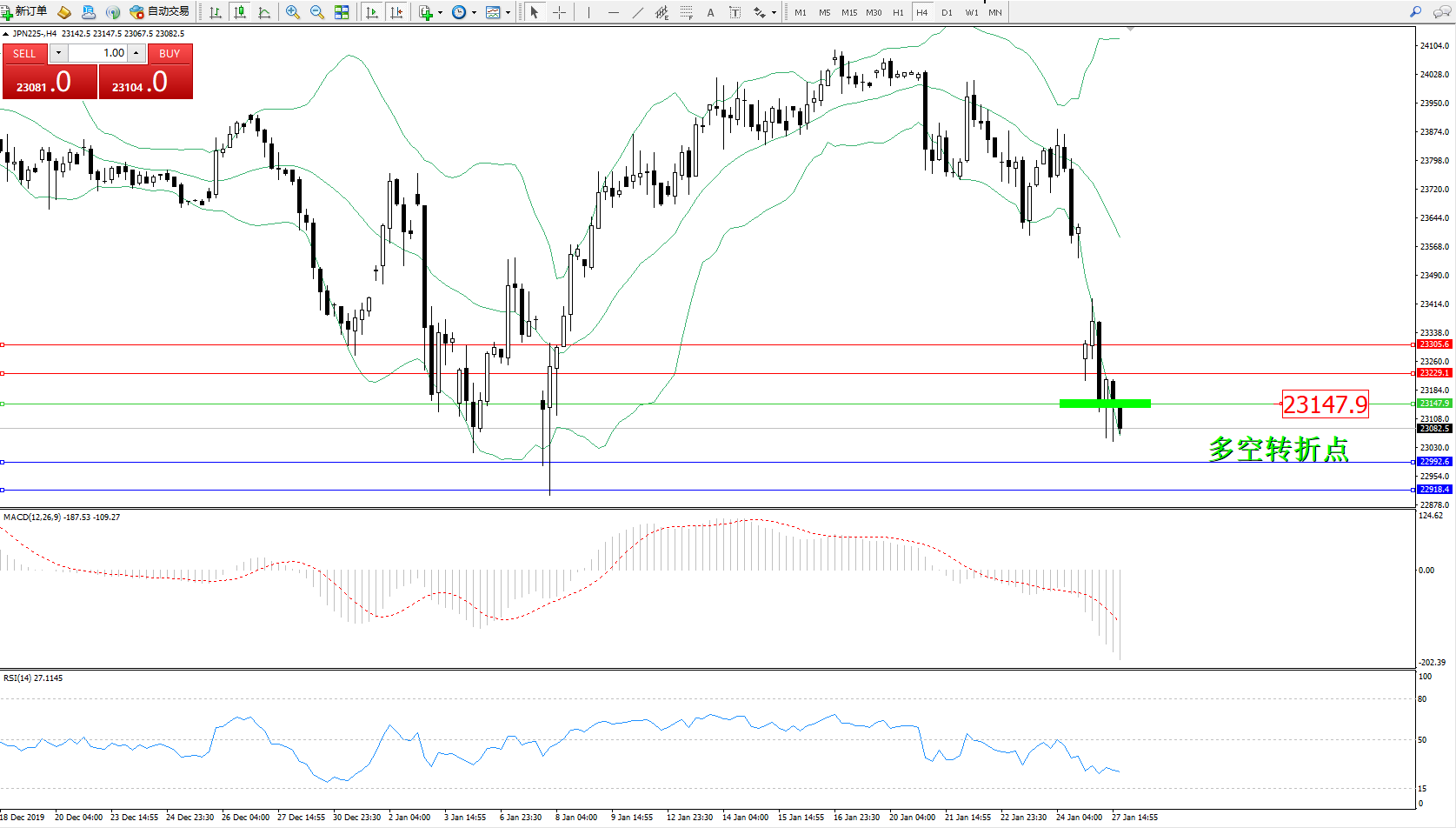 日经225指数1月27日(周一)收盘下跌508.68点,跌幅2.13%,报23318.50点。日内亚洲多地金融市场仍因春节假期休市,仍在交易中的日本股市则重挫逾2%,而美股股指期货在盘前也跳跌1%,资金因此悉数流入避险资产领域。而在突发“黑天鹅”事件影响下,美联储本周政策决议措辞将存在相当大的不确定性,这也令美元指数走势承压;日本央行委员原田泰的任期将于3月25日结束,日本首相安倍晋三将于周二宣布接替日本央行委员原田泰的提名人选。