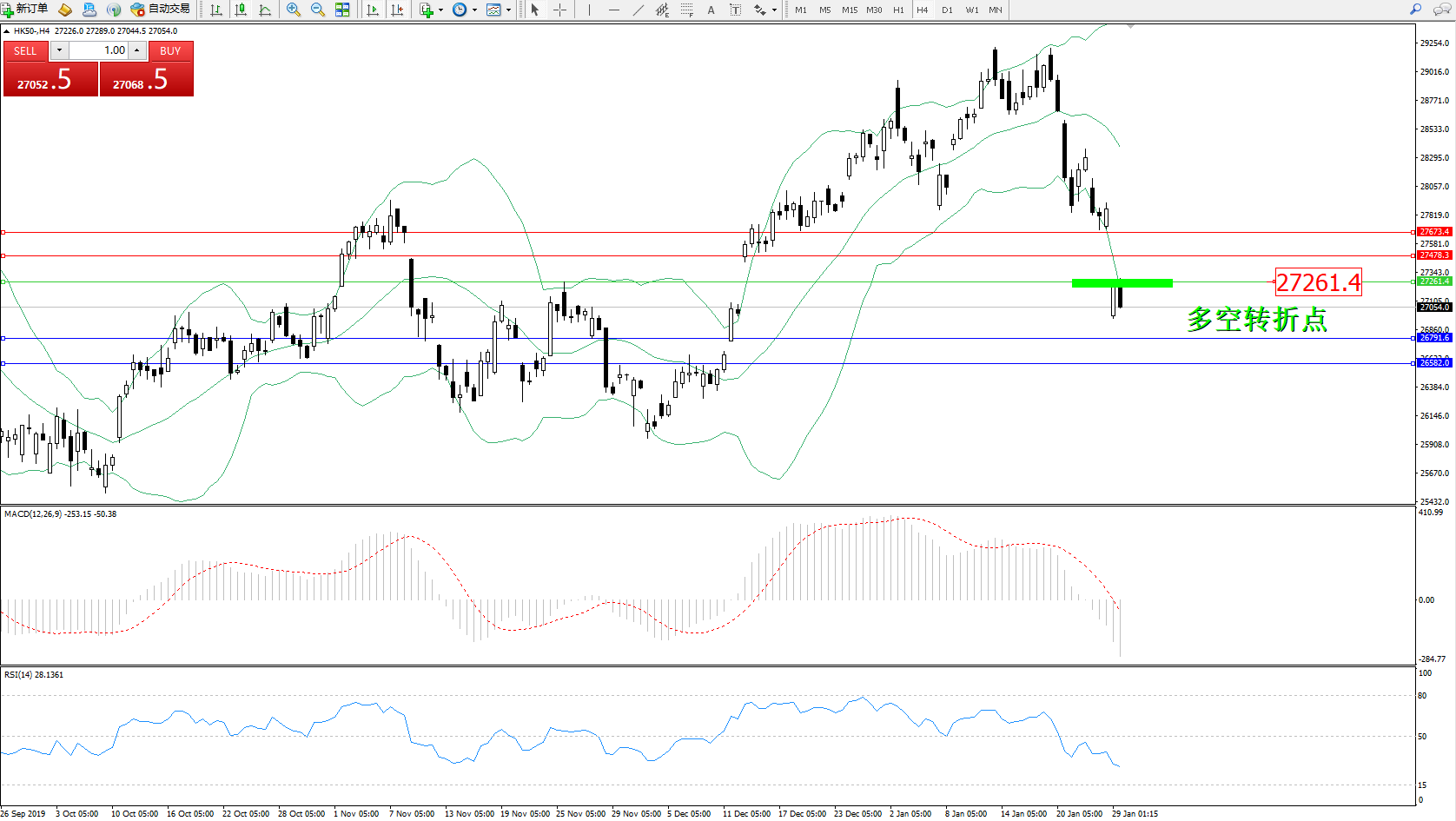 恒指HK50 ——4小时K线图显示: